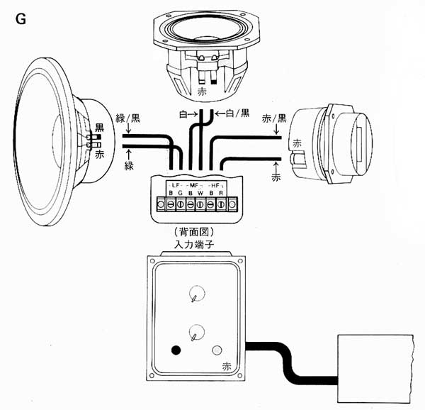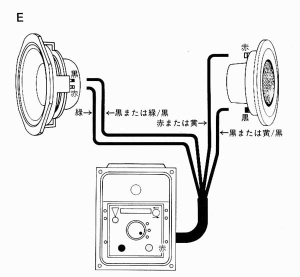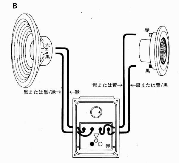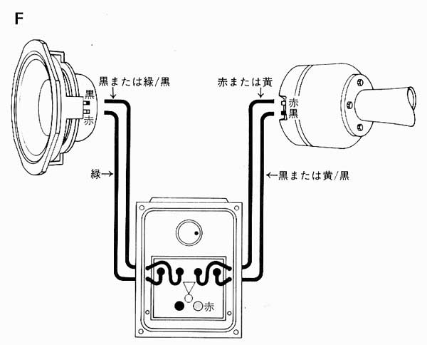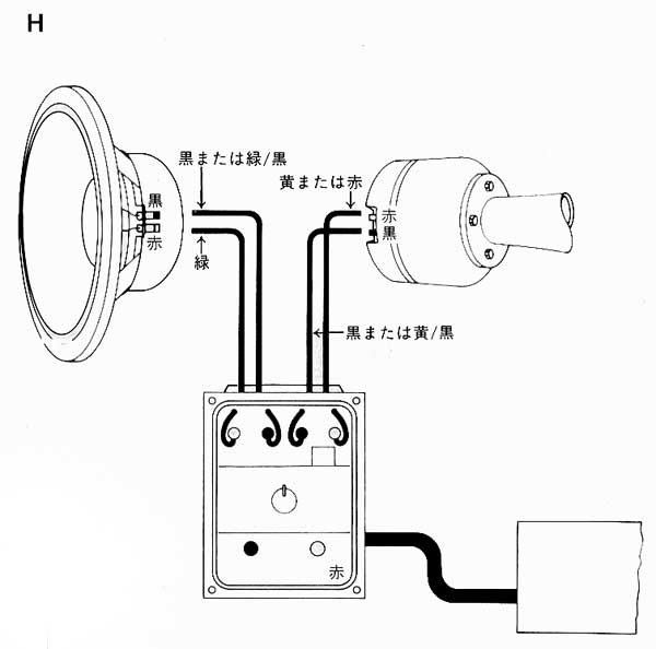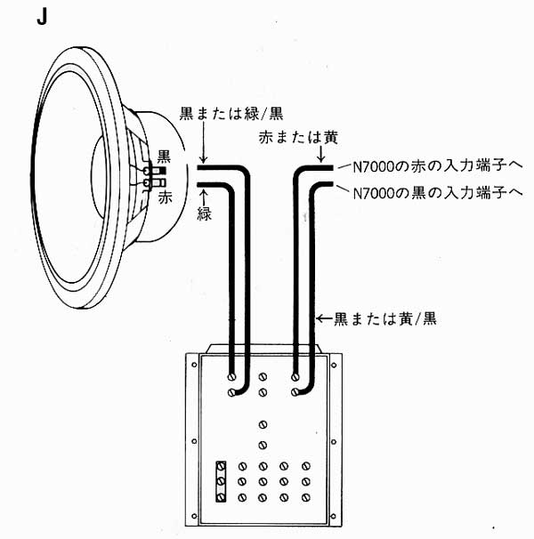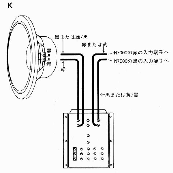 | 1:ユニットがD123の場合は、図Bの配線になります。 2:375は中音域ドライバーですので、高音域ユニット(075または077)とN7000が必要となります。 3:375をLX50と共に使用する場合、N7000を図Hのドライバーに置き換えて接続します。(すなわち、図Hのネットワークの黄のコードをN7000の赤色端子へ、黄/黒のコードを黒色端子に接続します) N7000と375、075(077)との接続は、図Nを参照して下さい。 |