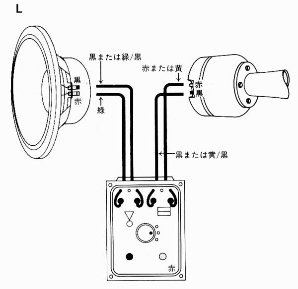 | ●ネットワークの接続 アンプの出力端子とネットワークの入力端子を接続します。ネットワークの黒色端子をアンプの(-)端子に、赤色端子を(+)端子に接続します。 大電力用のネットワークには、色分けされていない端子が付いています。白いライン上にある入力端子は "common"の意味を示す"C"のマークが付いており、アンプの(-)端子に接続します。他方の入力端子は(+)端子に接続します。ネットワークには入力コードをエンクロージャーの中に引き込む際に、気密を保つための小さな穴があいています。また、LX30は出力端子がコントロールユニットの裏側に付いています。 ネットワークとスピーカーユニットの接続は、ネットワーク選択表と配線図を参照し、各ユニットが正しい位相で動作するように注意して行ってください。この際、高音域ユニットの位相は、クロスオーバー周波数と使用するホーンレンズにより変化することに注意してください。 また、配線図はHL87、HL91、HL92、HL93をバッフル板に直接取付けた場合、ならびにHL88、HL89、HL90をホーンのマウスがバッフル板と同一平面を成すような位置に設置した時のものです。もし、ホーンレンズをリスナーの方向に15cm以上、突き出すか、または引込める場合には位相反転スイッチを取付け、男性ボーカル等のソースで十分な試聴を行いながら高音域のユニットの位相を切替え、最も自然な再生音が得られる位相条件を選んでください。 |