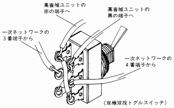| ●位相反転スイッチ AWG-18のコードを使用してスイッチを図のように結線します。スイッチがトップの位置にある時には、センターとトップの端子が導通し、スイッチを切替えると高音域ユニットの位相が反転します。通常の聴取位置でスピーカーシステムを試聴しながら、スイッチの操作ができるように、コードを十分に長くしておくと便利です。 |