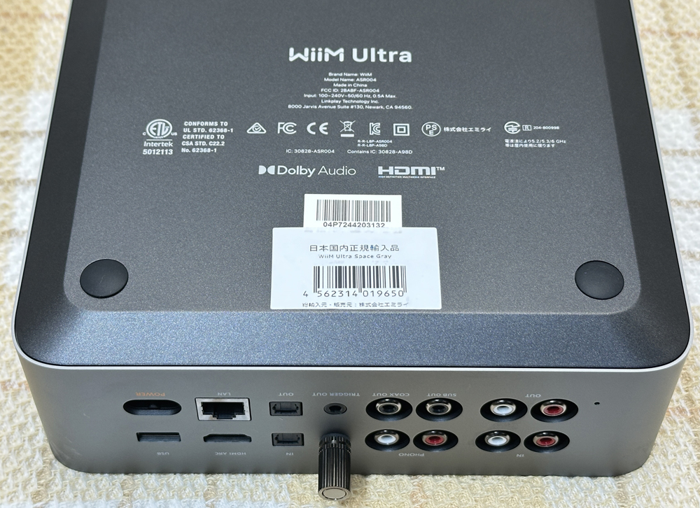 | WiiM Ultraのリアパネルです。電源はAC100V(メガネ)となります。